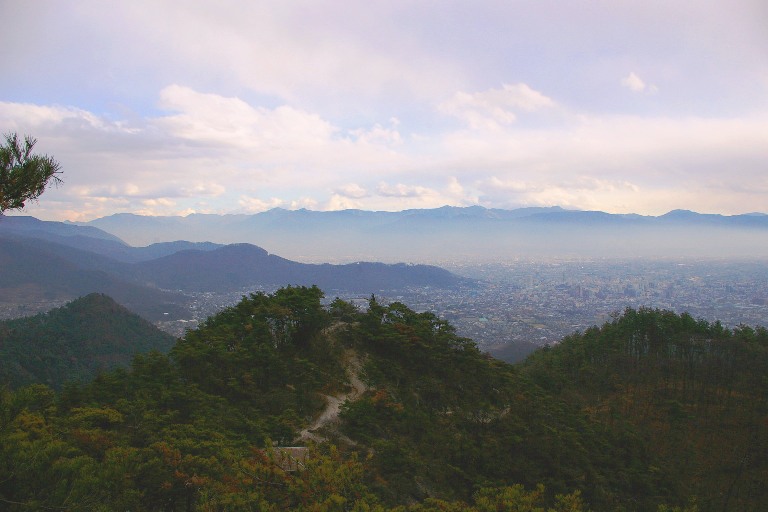 左から飯縄山、、雲に隠れた戸隠山、黒姫山、妙高山、